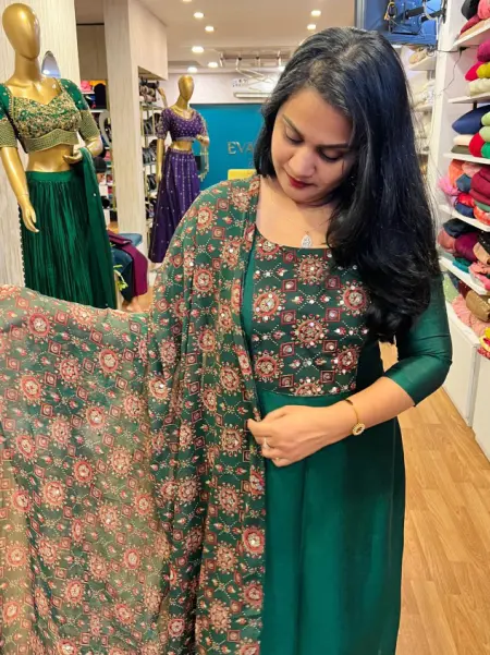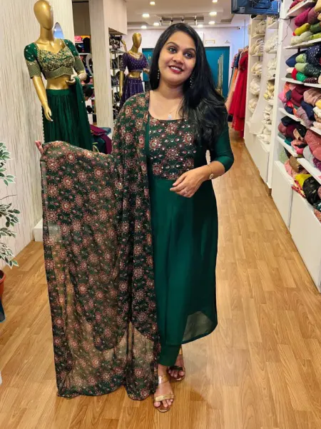 - Semi silk top, silk santoon bottom material and ajrak printed georgette dupatta