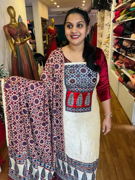 - Velvet top, silk santoon bottom material and modal silk dupatta